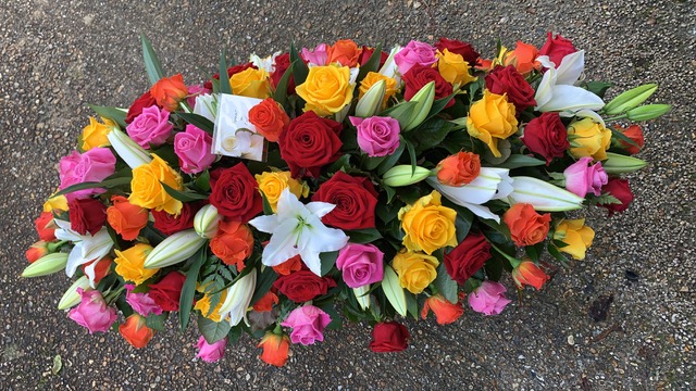 Classic looking double ended coffin sprays of any colour and size you are timeless! This one shown below even contained some small potted spring plants so that some of the family could each take a plant home afterwards and let it carry on thriving in their own garden as a living keepsake.