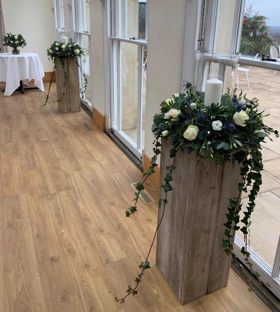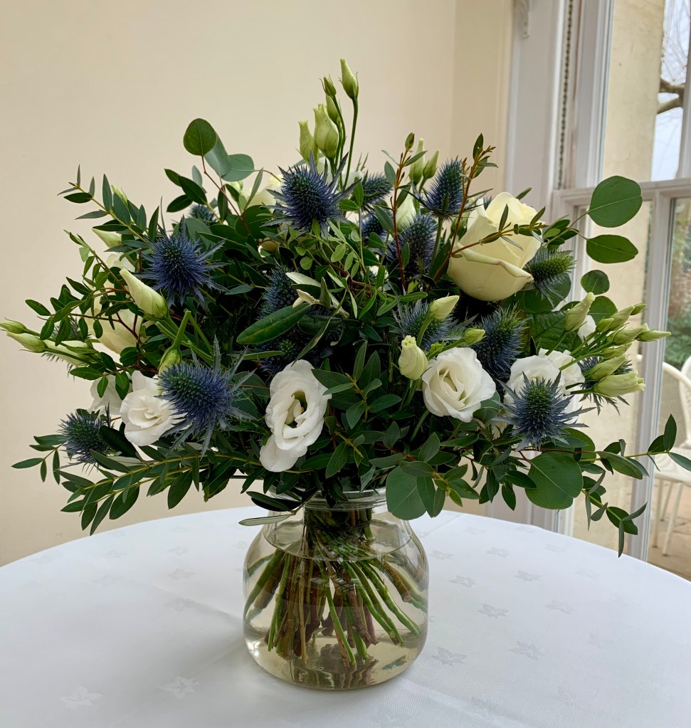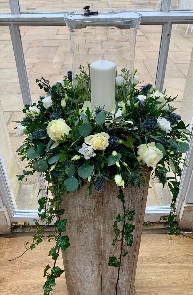 We were asked to create some beautiful fresh flower designs to enahnce the reception venue that was being used for a Proudly Scottish gentleman’s funeral. We used lots of ivory/white scented roses the classic dusty blue thistle as well as other white flower varieties and foliages including olive and different grey/green toned eucalyptuse’s for added texture and to make the overall designs appear more free flowing and not neat looking as specifically requested by the client. We also created two gorgeous lantern and flower rings that were each placed on top of our lovely mandmade lime washed wooden plinths. Each design was positioned either side of the gentlemans coffin. We had almost immediate feed back that our client “LOVED” everything we made for them!