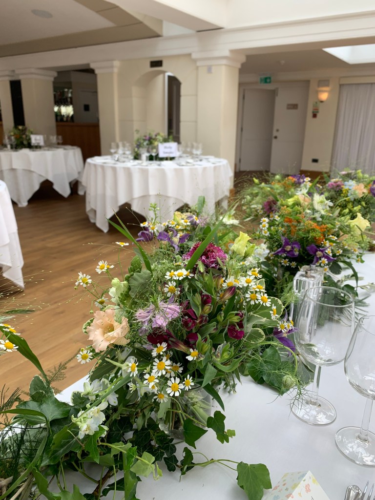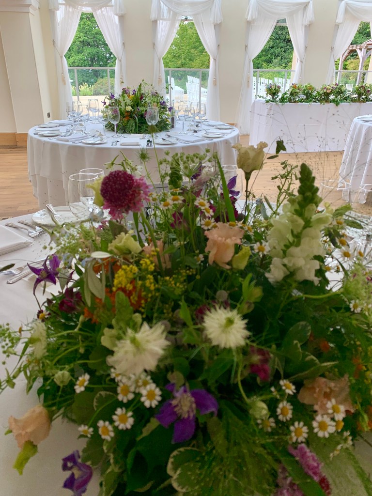 It was truly a riot of colour for this recent wedding! The brief was to create wild meadow style table designs using just delicate, gorgeous, summer flower varieties and foliages in a rainbow range of colours….and I think we achieved it!!! Also using eco products and containers making these designs completely sustainable and environmentally kind 🙂 what’s there not to LOVE!